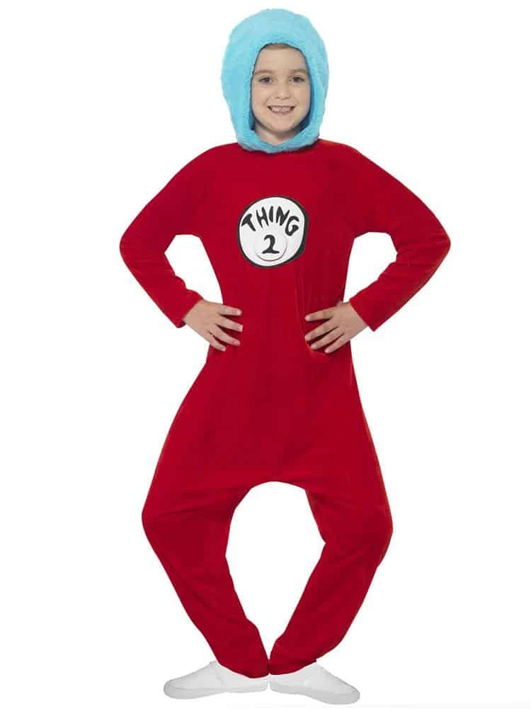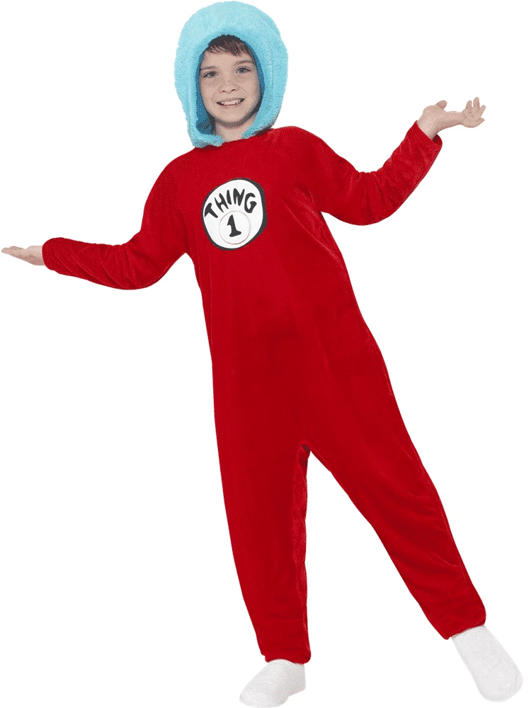 This Dr Seuss Thing 1/2 Costume is a very popular character by Dr Seuss, and perfect for book week at school. This official Dr Seuss Thing 1/2 Costume product features a badge for you to choose thing 1 or 2 so a great dressing up costume for siblings or twins to wear for book day ! The Dr Seuss Thing 1/2 Costume is a red comfy jumpsuit style so perfect for a long day a school. The Dr Seuss Thing 1/2 Costume jumpsuit has velcro fastenings down one of the sides and a soft blue hood just like their hair! This is a fun costume to cause some fun havoc and mischief on world book day. Dr Seuss Thing 1/2 Costume is available in many sizes.
