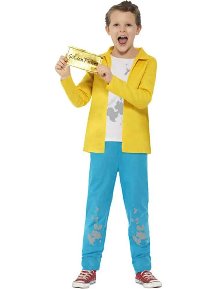 This Roald Dahl Charlie Bucket Costume will delight children and teachers alike. The Roald Dahl Charlie Bucket Costume includes a bright yellow jacket with attached white mock t-shirt, plus a pair of soft blue trousers with an elasticated waist. The Roald Dahl Charlie Bucket Costume also includes a metallic fabric Golden ticket with velcro to fit inside the jacket.